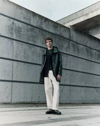 The core of the capsule is a reimagined raincoat. Cut from rubberised cotton, it’s waterproof and breathable. It comes finished with clean lines, snap fastenings, and functional drawstrings. It’s not chasing trends. It’s setting the tone. It works just as well at the bus stop as it does on set.